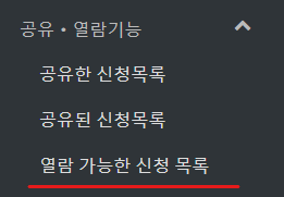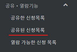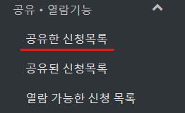 좌측 메뉴 「공유 ・ 열람 기능」에서 「공유한 신청목록」을 클릭하여 확인합니다. - 공유된 신청목록